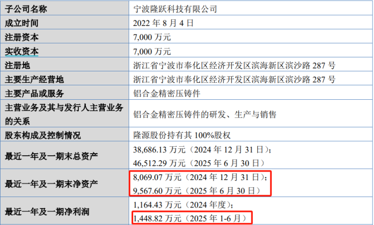 另据信息走漏,“宁波隆跃科技有限公司”是隆源股份的全资子公司,招股书走漏,该子公司在2024年末和2025年上半年末的净财富永诀为8069.07万元和9567.60万元,2025年上半年技术的净财富净增多金额为1498.53万元,而同期该子公司已毕的净利润仅为1448.82万元,比较净财富增量少了约50万元,这并不合乎普通的管帐核算逻辑。