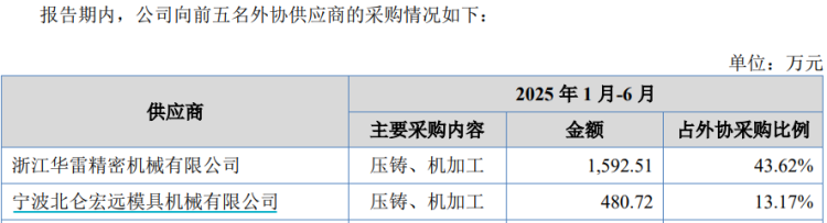 与此同期,招股书第126页走漏的“公司上前五名外协供应商的采购情况”走漏,2025年上半年向第一大外协供应商“浙江华雷精密机械有限公司”采购压铸、机加工金额为1,592.51万元,而与此同期,招股书第128页走漏的“公司上前五名供应商采购情况”则走漏,同期向该供应商采购外协加工1593万元,前后两组数据存在轻细的互异。